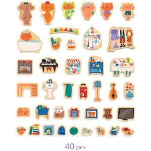 With Inzebox, you can play with wooden magnets on a house-shaped metal box. Have fun decorating the 6 rooms to bring them to life (loft, bedroom, kitchen, living room, bathroom and games room)! Each side of the box represents different rooms for double the fun. Create endless scenes! Premium wooden magnets. Promote chi