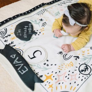 Every day marks a milestone with our Baby Milestone Mat. Cotton canvas boasts earthy design, and includes chalk cloth word bubble, chalk cloth banner, canvas numbers 1-12, canvas months x 12, and a measuring tape. Just add baby! Materials: 100% cotton Age: 0+ Dimensions: 25.6 x 36 inches Â