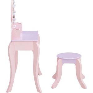 Fantasy Fields' Little Princess Rapunzel Vanity Playset is a fun addition to playing dress-up. Made of engineered wood with rounded corners and carved cabriole legs, the vanity table features an acrylic oval mirror, surrounded by LED lights. In pink and lavender, it features a rainbow accent around the mirror, where an