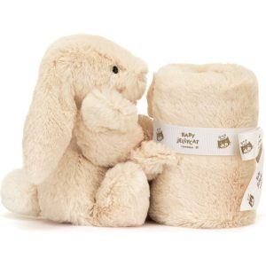 Bashful Luxe Bunny Willow Soother offers the perfect comfort in luxuriously soft biscuit-gold fur. Little ones can cuddle up with the blanket or the tiny Bashful Luxe Bunny Willow holding on to the corner for the most joyful of dreams. This soother is tied with a grosgrain printed ribbon and presented in an elegant Jel