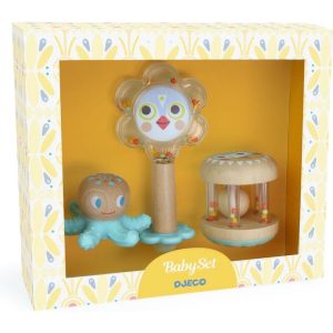 A baby set with a teething ring and two rattles. An octopus-shaped teething ring made of wood and soft silicone. A flower-shaped rattle with a sweet illustrated face on one side, and a mirror on the other for self discovery. A wooden rattle with small colored balls and a large wooden ball to watch and…