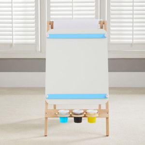 Get your little artist creating with our Easel Does It! Our wooden easel sits neatly on the floor, and comes with a paper roll, 4 giant circle magnets to hold papers on to the magnetic chalkboard, and 3 paint cups. Flip sides, and you have a dry erase board. Cup holders and shelf fit easily…