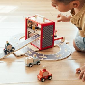 All aboard! With this colorful wooden train set, your little one will role-play as a conductor, an engineer, or a passenger for hours. The battery-powered locomotive has a working headlight and goes forward and backward – but that’s just part of the urban fun. The train station, shops, construction site, airport and op