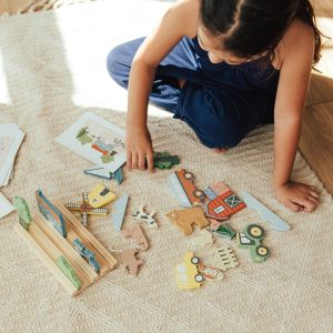 Our My Town Picture Matching Game is a great and fun way to help your kiddos learn placement and sequencing by matching the wooden objects to the pictures.  Our high-quality  set includes a chunky wooden base that holds 21 assorted vehicles, trees, houses, bikes and more.  12 cardboard pictures with scenes to match.  L