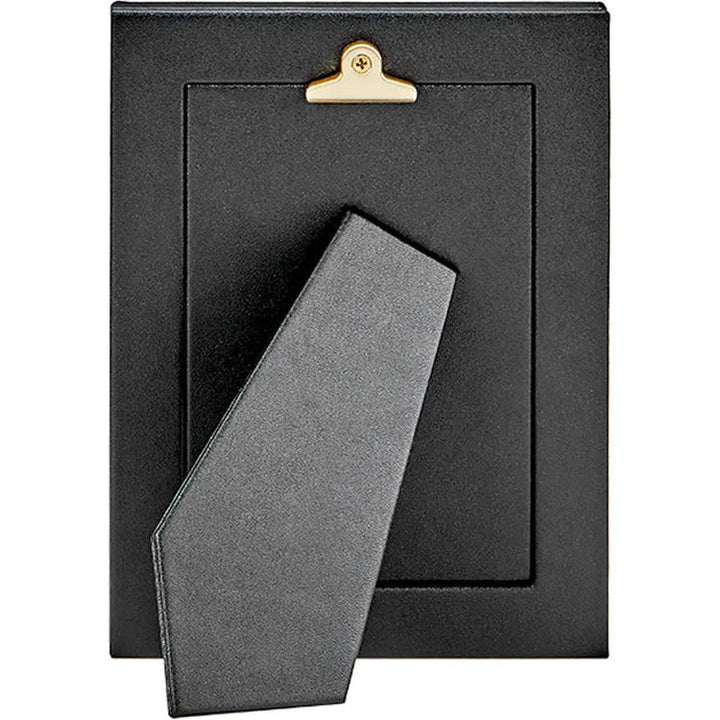 This rich leather frame beautifully accents your favorite photo. Handcrafted frames, wrapped in leather on both sides, with a sturdy metal easel. Convenient rear drop-down door for easy and frequent access to photos. Overall Size: 6" x 8" Opening: 4" x 6" full-grain leather