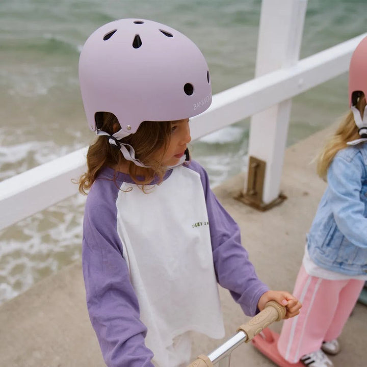 The Banwood Eco Helmet combines safety and sustainability, made from durable ABS recycled materials with a protective foam lining. Lightweight at 355 g, it features a dial-fit adjustment system, recycled chinstrap, and ventilation for comfort. Designed for ages 3+ and is CE-certified for reliable protection. Size adju