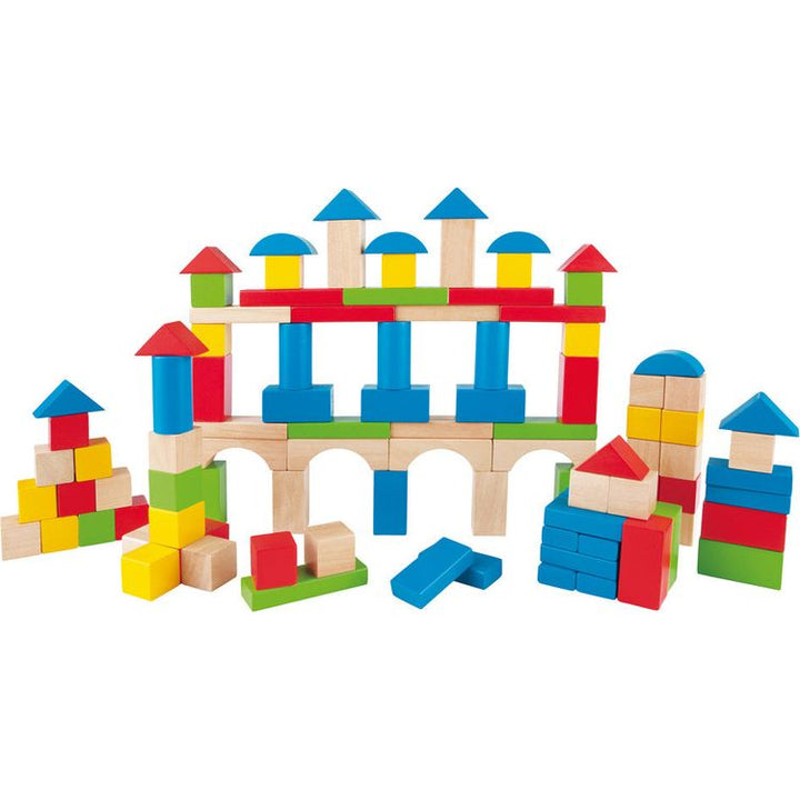 These sturdy blocks will inspire hours of play and generations of builders. Explore how different shapes can make towers higher or wider. How high can you build without toppling over? Build a house and tell stories about who lives there. Sturdy, solid, and including all of our favorite colors, this Hape block set inclu