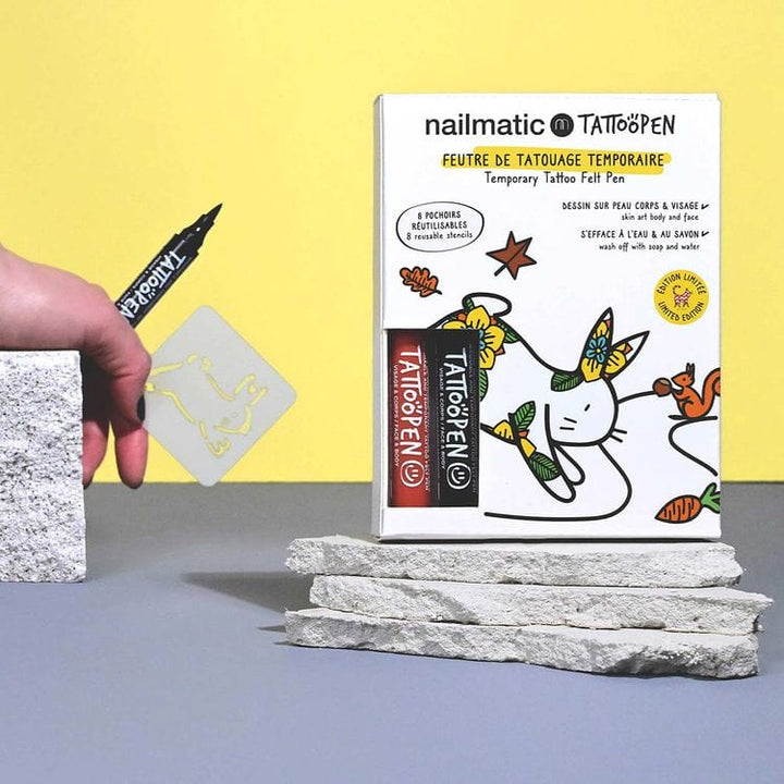 Tattoopen Kit, The Rabbit by Ami Imaginaire – Immerse yourself in the animal world of this new limited-edition kit created with the artist Ami Imaginaire!The set contains : 1 brown temporary tattoo pen, 1 black temporary tattoo pen and 1 sheet of 8 reusable stencils with designs inspired by the world of Parisian artist