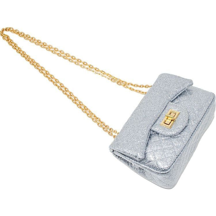 This classic quilted sparkle mini purse for kids is perfect for bringing along your glittery essentials! With it's sparkly quilted finish and gold-colored hardware & chain, you can be sure this mini handbag will draw attention and turn heads everywhere you go! Shiny quilted finish Twist lock closure Gold color hard