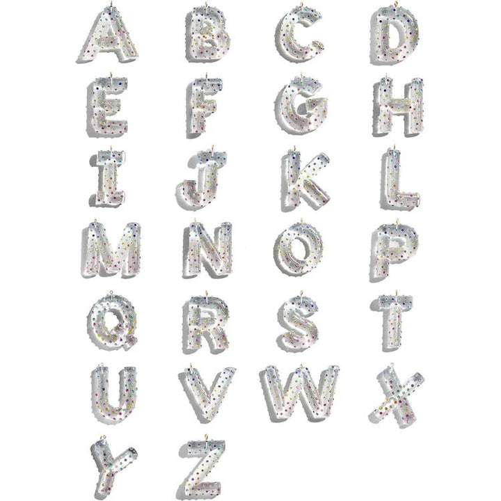 Add some vibrant hues to your bag with the Confetti Initial Bag Charm. Featuring the letter of your choosing in a bold, bubble-letter font, embellished with dainty multicolored stones for added sparkle.  Keychain closure Clear initial with rainbow studded gemstones. Dimensions: 5.07" x 2.4"   Ages 3+ Materials: 60% res