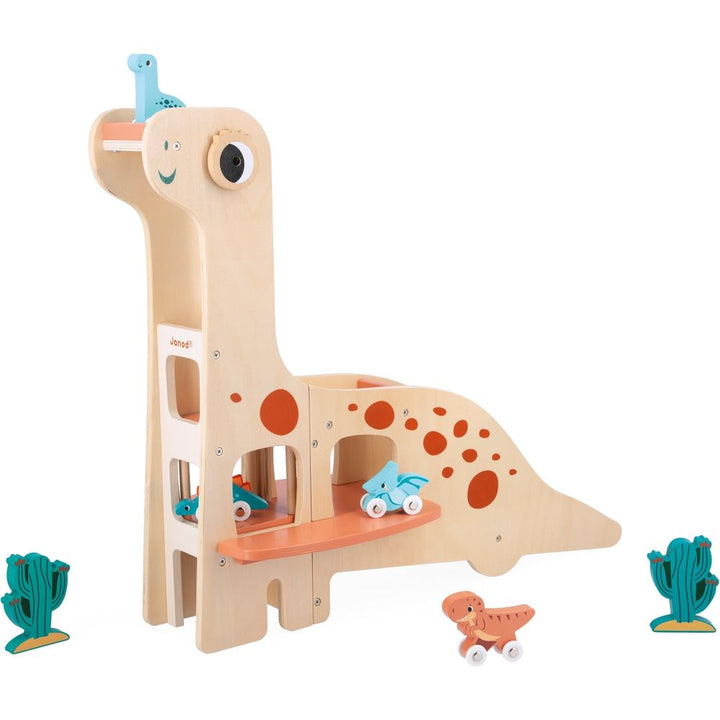 VRRRoom! Back to the pit for the T-rex! Here is a magnificent garage in the shape of a diplodocus. The 4 rolling dinosaurs can go off for a jaunt and come back to the garage to rest… The garage is equipped with a lift allowing direct access to the first and second floors. To get back down? There are two possibilities