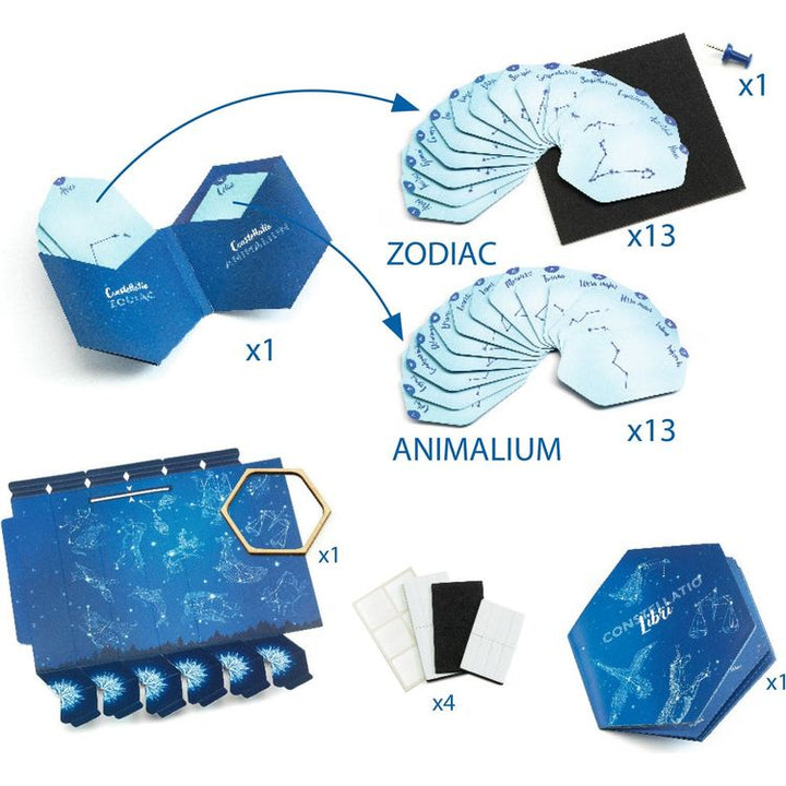 A creative kit to make a constellation viewer. Punch the stars on the cards to recreate the patterns of the 26 selected constellations (Zodiac signs and animals), and watch their image form through the previously assembled viewer. It’s so magical to watch the hidden constellation illustration appear! A booklet is inclu