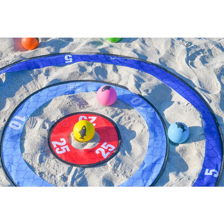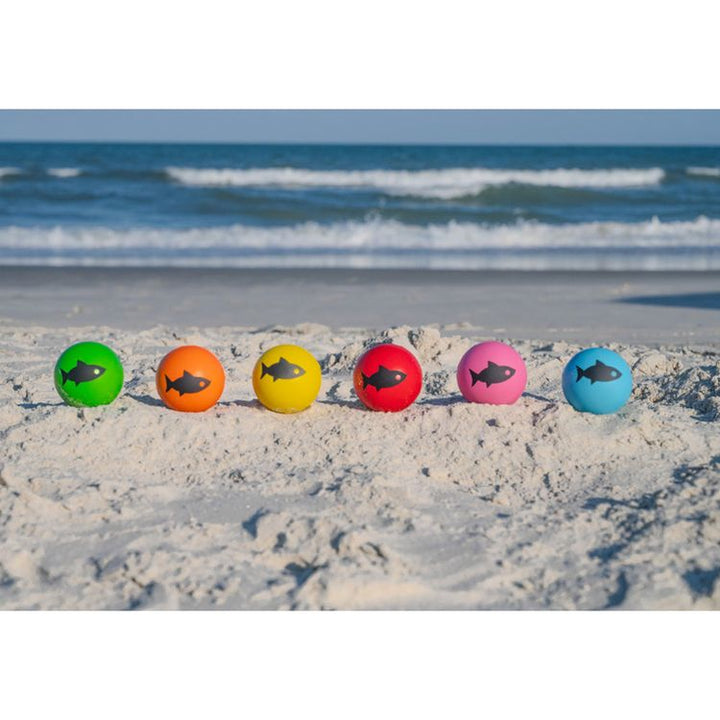 FLY schools of FISH up the ramp, high into the sky, and try to land them in the “nets” to score points! It's fun, fast-paced, and simple to play. You can compete with up to 6 players, either individually or as teams. SIMPLE SCORING: There are 3 target "net" rings provided: the large ring is 5 points, medium is 10, and