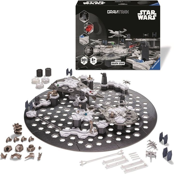 Action-packed space duels are brought to life with the GraviTrax Star Wars Deathstar action set. It allows you to discover the legendary encounter between the Empire and the Rebels from Star Wars. With elements and components from GraviTrax in the exclusive Star Wars design, you can create your own exciting GraviTrax t