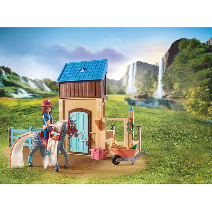 Join Amelia and Whisper at the Pony Stable! Open the fence to the pony stable and join Amelia in caring for and feeding the ponies and Alpaca! Includes lots of storage to hang brindles and saddles and store other grooming equipment. Use the glitter brush to comb through the horse hair or add the hair clips for differen