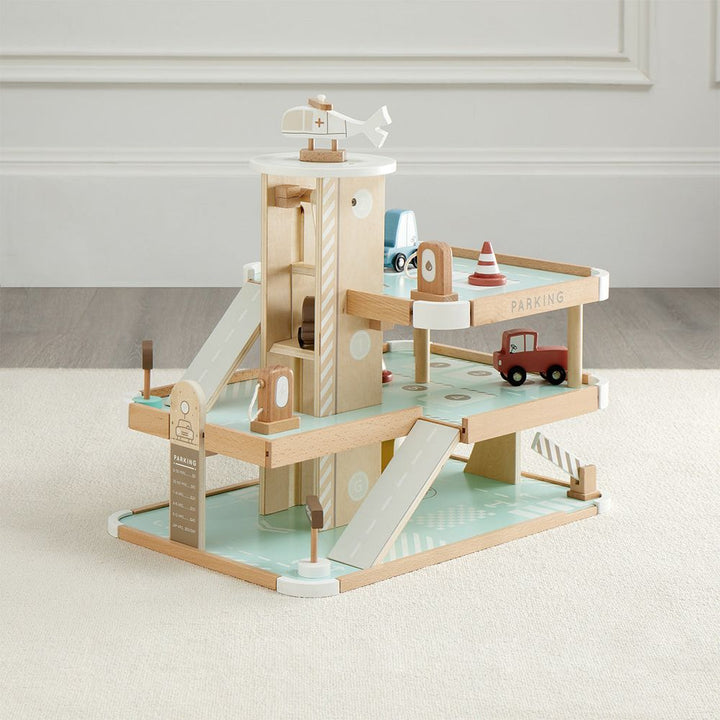 Your little tot will drive into fun with our Little Tot Parking Lot. Our quality wooden parking lot has 3 floors of imaginary play including ramps, helipad and helicopter, 3-floor crank elevator, 4 motor vehicles, safety cones, signs, gas pump and charging station, and more! Simple assembly, and you’re ready to go.