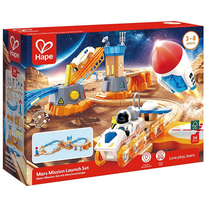 Ground control this is the Mars Launcher speaking! Inspire your mini astronaut as they propel the space train to Mars and explore the red planet with the rover and satellite vehicle. Glow-in-the-dark elements and interactive components enhance imaginative play making it perfect for sparking creativity and cognitive dev