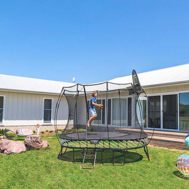 For the jumping enthusiast with a long and narrow yard. Perfect for the urban yard or tucked away in a space that is longer than wide. The Medium Oval trampoline provides 77 square feet of jumping freedom. Max Weight Capacity: 1500lbs Single Jumper Weight Capacity: 220lbs Trampoline Height: 9' Jumping Mat Dimensions: 8
