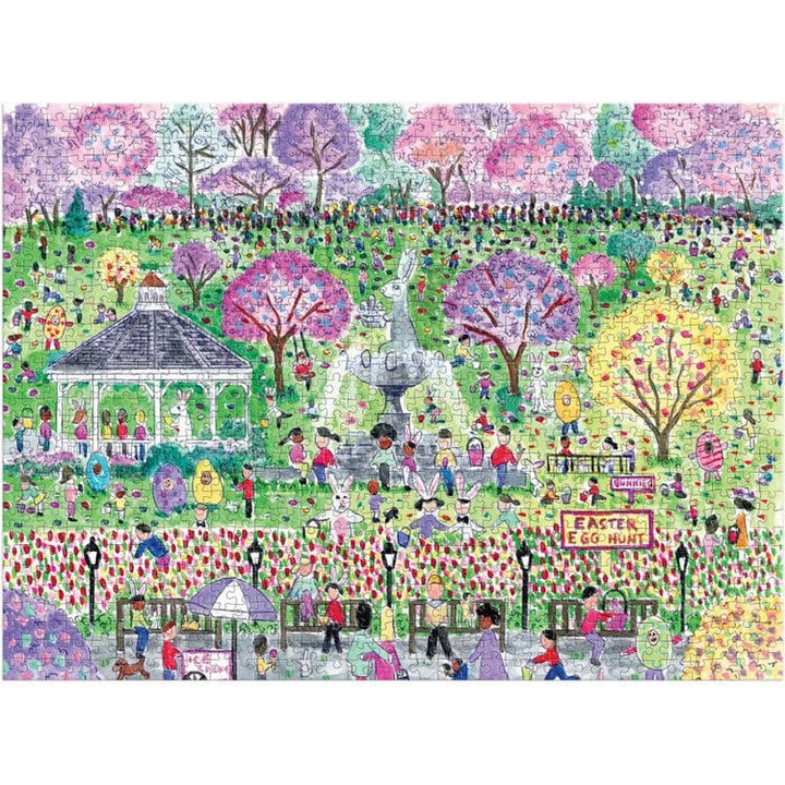 Award-winning designer, illustrator, and creative director Michael Storrings captures the spirit of Easter festivities with lawns full of happy children searching for treasures in a whimsical park. The Michael Storrings Easter Egg Hunt 1000 Piece Puzzle is complete with sherbet-colored trees, an Easter bunny fountain,