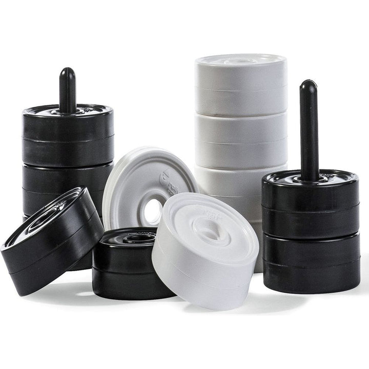 A "larger than life" checkers set will attract crowds and bring a new dimension to any recreation area or garden. These sets are eye-catching but are also designed to be played. Ideal for indoor or outdoor play, constructed of tough all weather black and white resin Sturdy yet lightweight and easy to lift; perfect gam