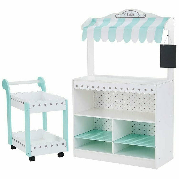 Give your little one a bake shop of their own with the Teamson Kids My Dream Bakery Shop Dessert Stand with Cart. This bakery set features a white finish with aquamarine accents and polka-dot details for a fun addition to your child's play area. This bakery shop toy set includes a treat stand with awning and versatile