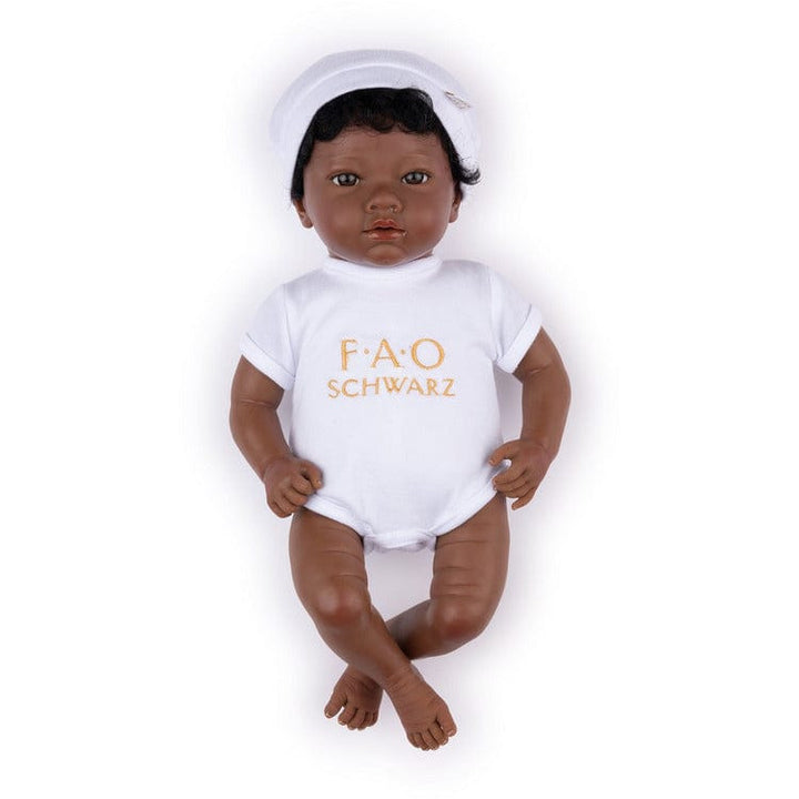 Doll with dark skin, black curly hair and dark brown eyes Ethnicity: African-American. Facial expression: happy. Unisex doll wears a short-sleeved bodysuit with an embroidered FAO SCHWARZ logo and a cap. Expressive face: the eyes have lashes, and the mouth has glossy lips. Arms, legs and head are made of vinyl, a soft-