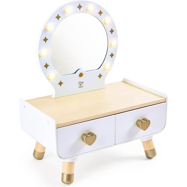 Introduce your child to beauty with this stylish dressing table. Fostering creativity and fine motor skills, children explore makeup artistry, encouraging self-discovery and confidence. This elegant dresser features lights, a mirror, a functional hairdryer, and various makeup pieces that can be neatly stored in the two
