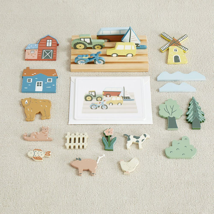 Our My Town Picture Matching Game is a great and fun way to help your kiddos learn placement and sequencing by matching the wooden objects to the pictures. Our high-quality set includes a chunky wooden base that holds 21 assorted vehicles, trees, houses, bikes and more. 12 cardboard pictures with scenes to match. L