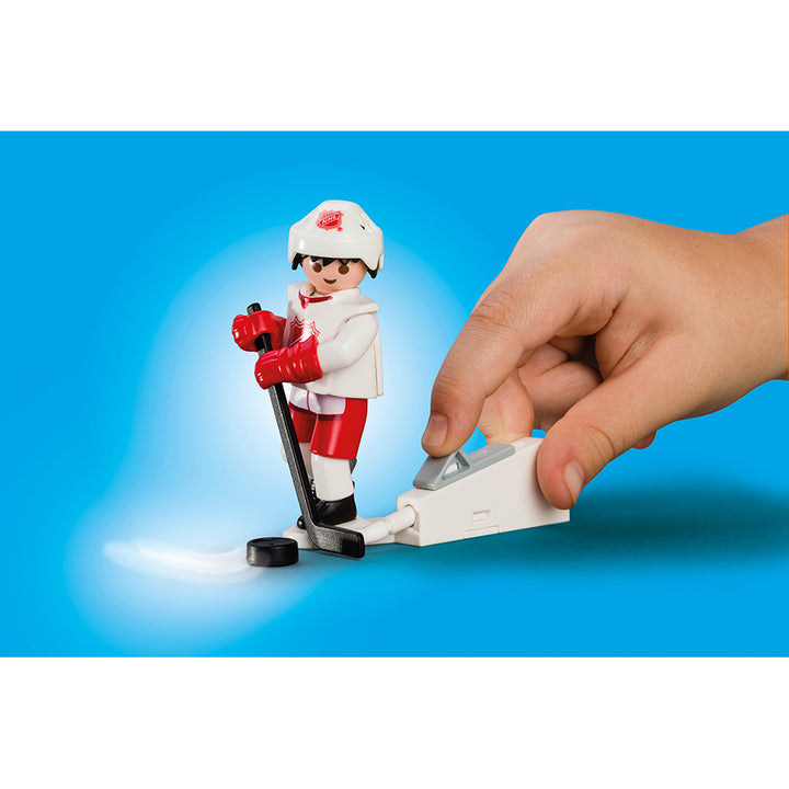 It’s game night at the NHL® Take Along Arena! Designed in a convenient take-along case, this set is perfect for on-the-go fun. Simply fold down the front panel to reveal an exciting hockey game. Players can get ready for the game in the locker room area, which also provides room to store all your hockey gear. Once the