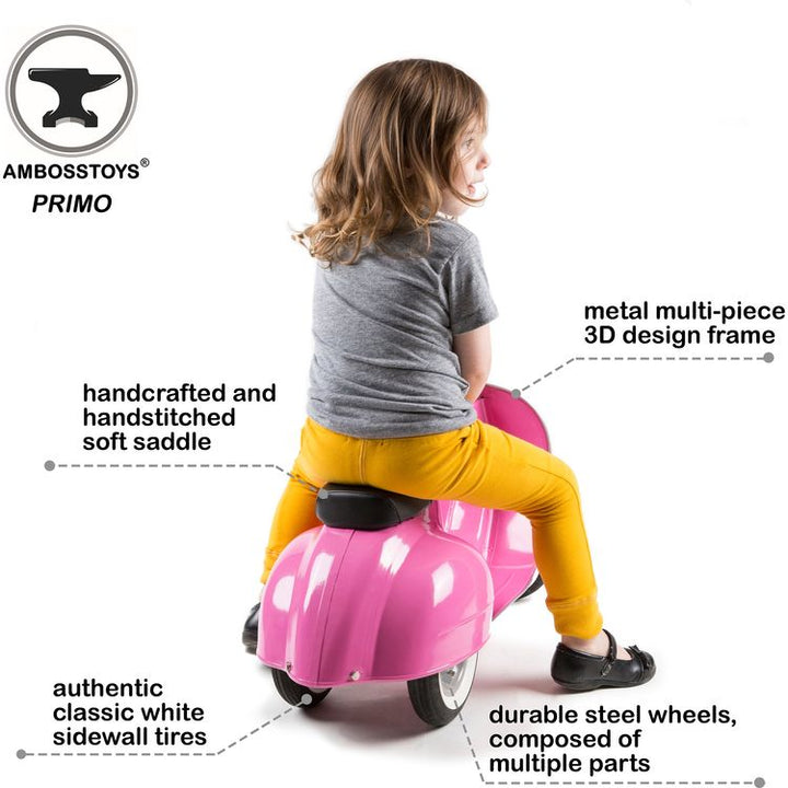PRIMO is the ultimate toy, as our frame is built for longevity with only durable and high-quality materials. Safety and quality are our top priorities, making the self-propelled PRIMO ride-on scooter ideal for one year old up to 5 years old. Our frame consists of solid metal sheets, welded by hand out of several indivi