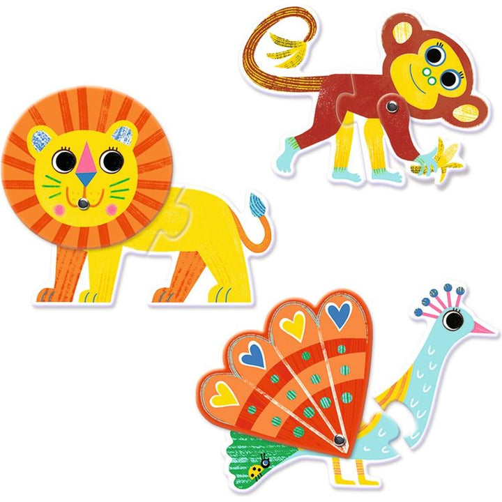 This gorgeous new addition to the Djeco Puzzle Duo is Animal Articulo! not only a puzzle to match animal body parts but each animal has a moveable hinge to make them move and dance! There are 12 2-piece puzzles that your child matches together. When you're not playing with your puzzle tidy the pieces away in the sturdy