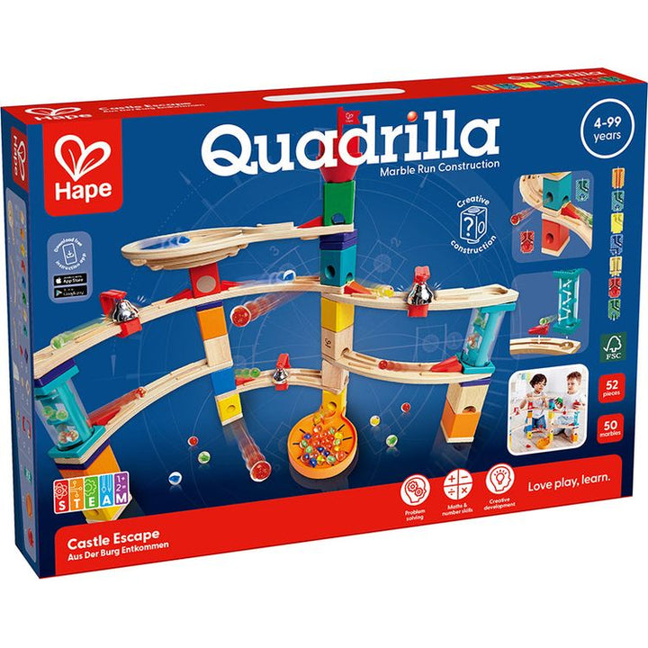 Escape from the castle's rotary tower with this exciting Quadrilla set featuring two transparent stairways. As the marbles make their way down the rail they sound three hanging bells. S.T.E.A.M DEVELOPMENT: This set encourages your child’s development in various science, technology, engineering, art and math skills. CO