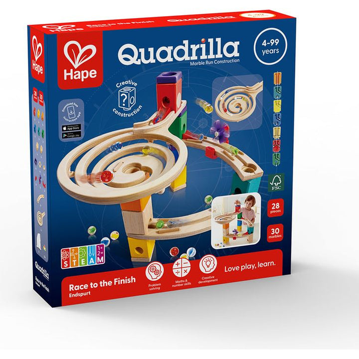 The Race to the Finish is designed as a beginner's set. Drop two marbles into the top and watch as they race down different paths to the bottom. Each of the seven different color blocks has a different function, and it's the world's only kinetic marble run. Every Quadrilla marble run is different and provides a combina