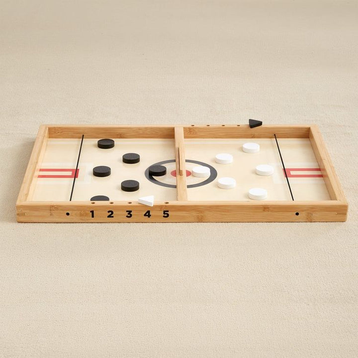 Get your competition on with our Sling-a-Ling Table Hockey Game. Play on any table, on the floor, or slip it right into our Land, Sand and WaterTable for a perfect gaming experience. Comes with 6 black and 6 white pucks, 2 different center gates to increase or decrease difficulty level, and 2 scorekeepers. Pull back