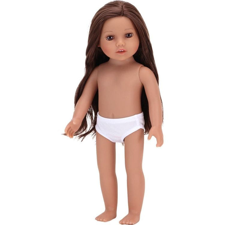 "Miley" has long layered brunette hair and lashed realistic brown eyes. This 18" posable all vinyl doll comes in a bright purple dress with a light gray sash and matching ballet flat shoes, with a pair of white panties underneath. Miley has French-tipped fingernails and subtle make-up and her rooted hair is ready to be