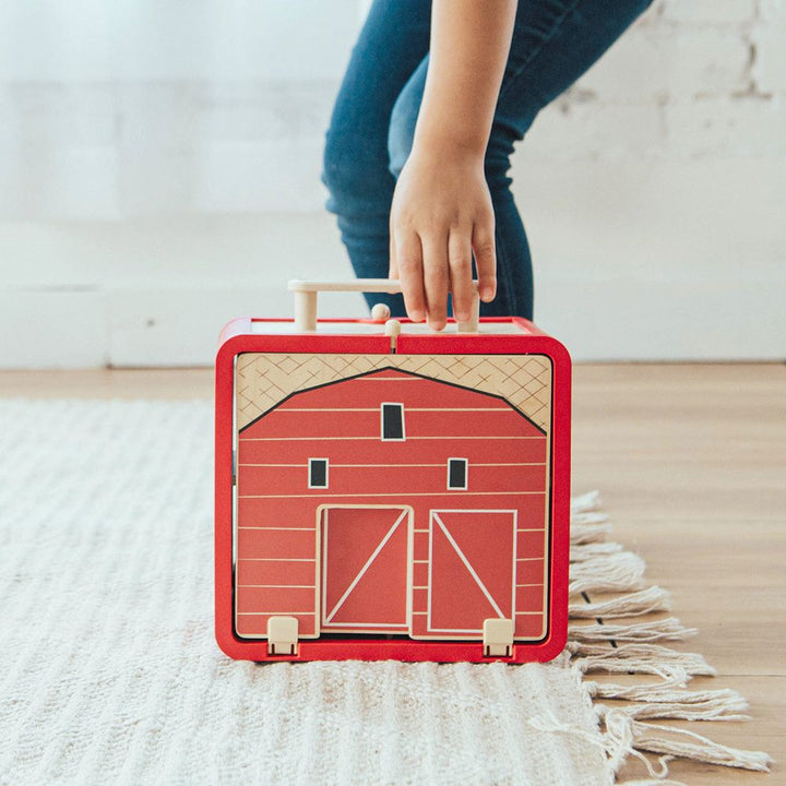 Your kiddos will love our Take with Me Farm. It comes with 13 wooden pieces including animals, farmers, vehicles, bales of hay, a fence and much more.  But the best part is kids can pack up all the pieces into the carry along barn (with functioning door) and go anywhere. Perfect for car rides, plane rides, or just