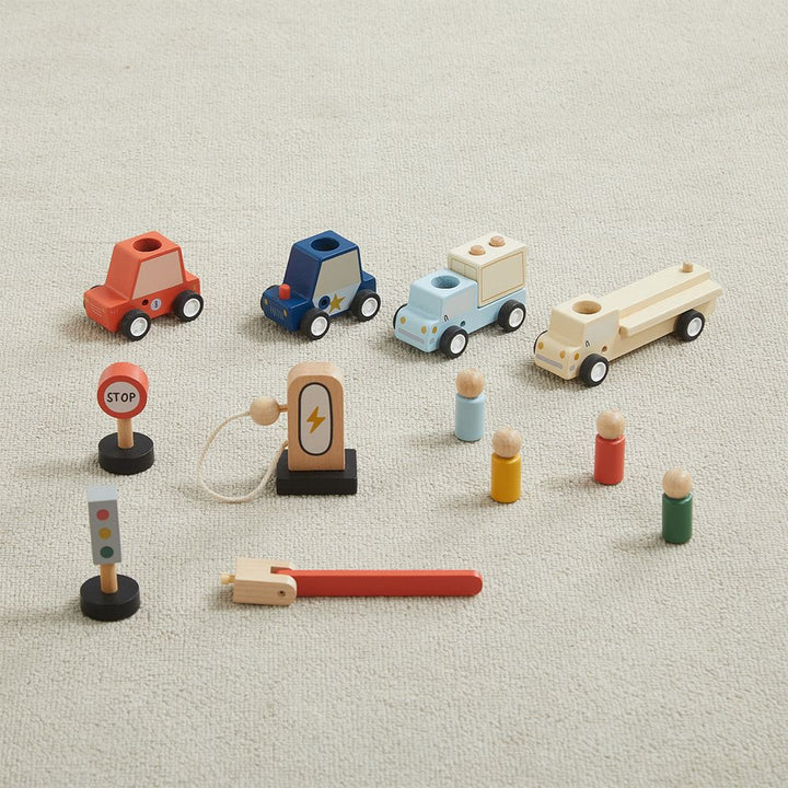 Your kiddos will love our Take with Me Garage. It comes with 12 wooden pieces including cars, trucks, peg people, ramps, signs, charging station and much more. But the best part is kids can pack up all the pieces into the carry along garage and go anywhere. Perfect for car rides, plane rides, or just quiet imaginary