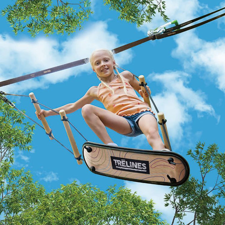 With the Surfin’ Swing, kids can carve through the air, feeling the rush of freedom as they soar higher and higher! Kids can twist, turn, and perform tricks mid-flight, all while suspended from sturdy ropes. Easily set up on Trelines’ Ninja Adventure, Swingset lines, or to a sturdy branch. Weight limit: 250 lbs Ages 5+