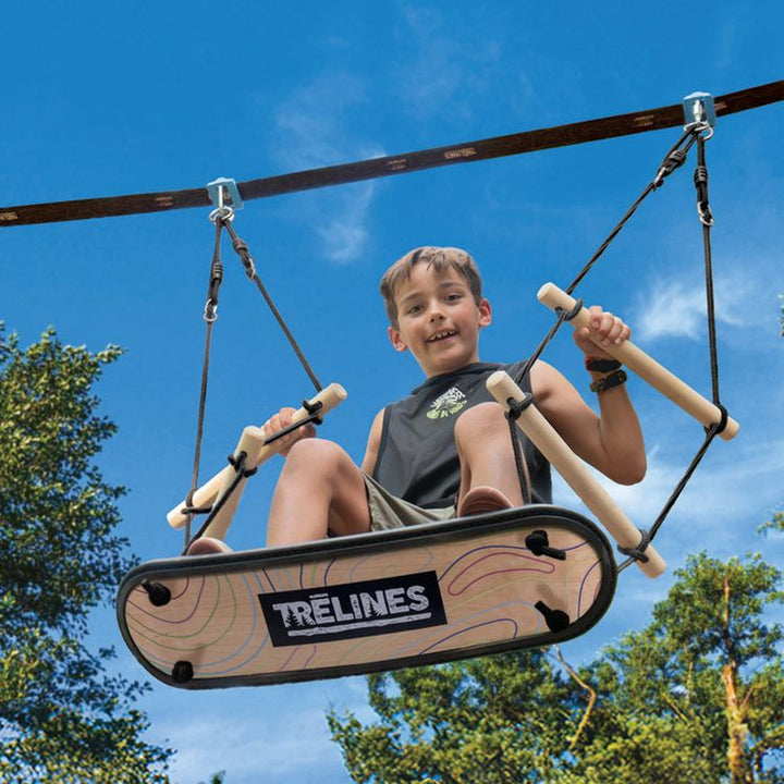 With the Surfin’ Swing, kids can carve through the air, feeling the rush of freedom as they soar higher and higher! Kids can twist, turn, and perform tricks mid-flight, all while suspended from sturdy ropes. Easily set up on Trelines’ Ninja Adventure, Swingset lines, or to a sturdy branch. Weight limit: 250 lbs Ages 5+