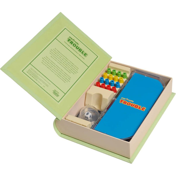 This Vintage Bookshelf Edition of TROUBLE brings a pop of fun to family game night! Push the Pop-O-Matic die roller, then race to get all your pieces home—but watch out, or you might get bumped back to the start! Inspired by the 1986 edition, this collectible, fabric-wrapped book brings back the fun and nostalgia of th