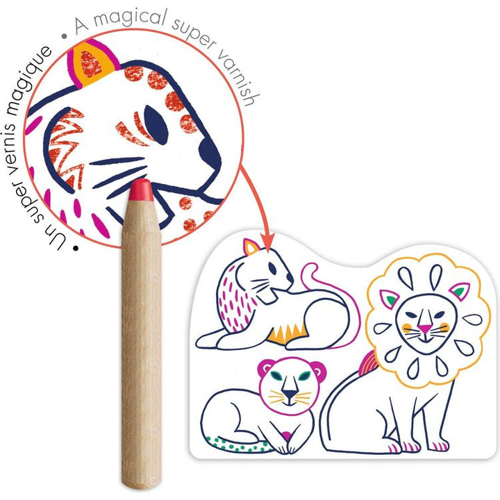 A pocket with 12 pictures to be colored in using a jumbo colored pencil, perfect for little ones. Color in the animal families using the pencil to reveal what’s hidden. It’s magic: the pencil only marks certain areas, uncovering patterns and revealing surprises! Magic effect: the pencil only marks the predetermined are