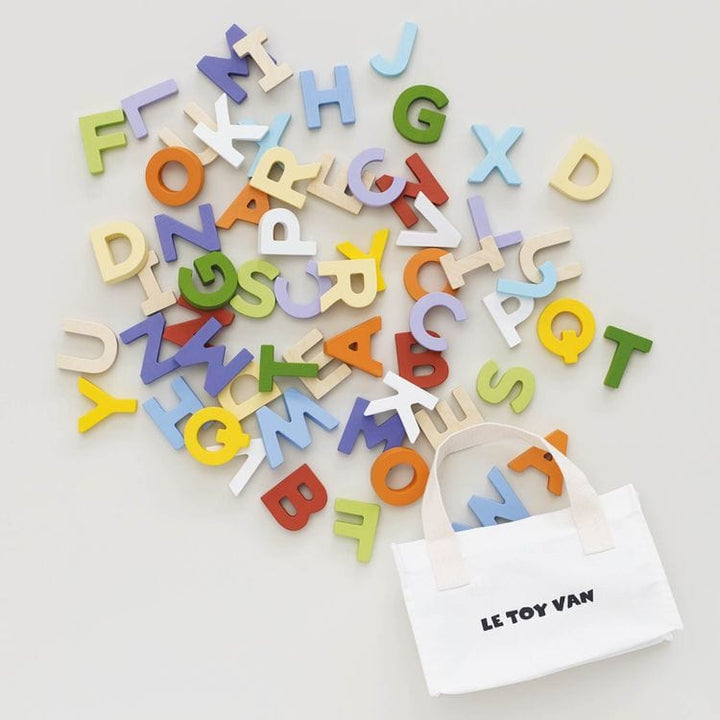 Learn the alphabet with this 60 piece letters set, crafted from sustainable, FSCâ„¢ – certified wood. Painted in sweet rainbow shades using child safe, water based stain, it comes complete with a cotton handled storage bag for stowing away safely at the end of a busy play session. Ages 18M+ Material: 90% Plywood, 10% Co