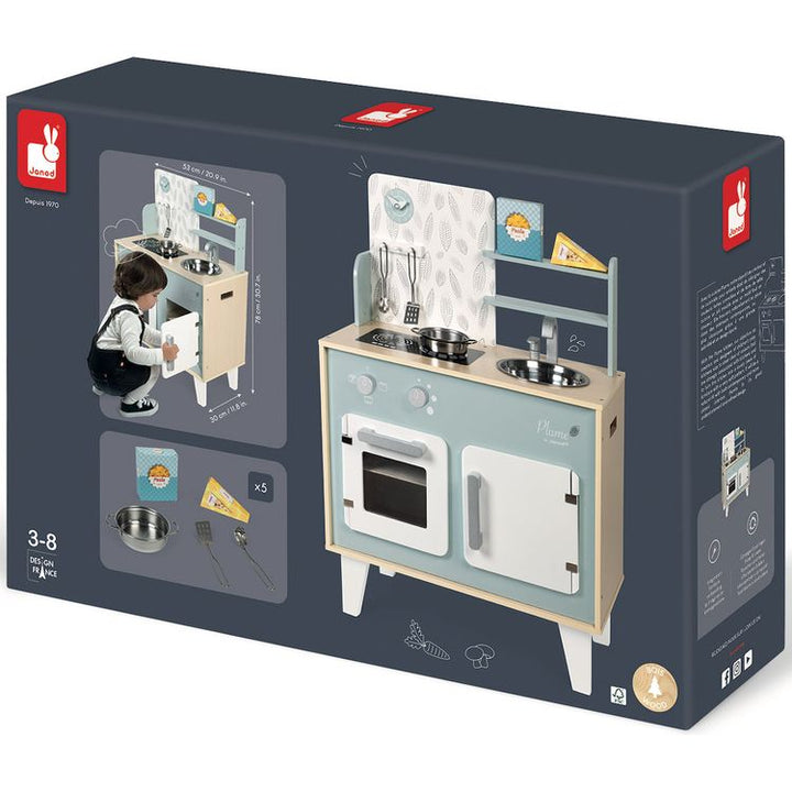 Hurry up! It's all kicking off in the kitchen! We’re rushed off our feet making a perfect meal for mum and dad! With this beautiful kitchen set, children from 3 years old will love putting together their own dishes! To help them become great chefs, this kitchen, made of natural wood and decorated in blues and greys, co