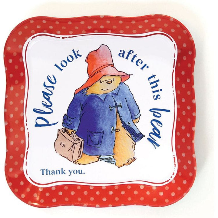 Paddington 14-Piece Tin Tea Set has all the essentials to create impromptu tea parties. Set includes tea pot with lid, serving tray, 2 cups, 2 saucers, 2 plates, 2 spoons, and 2 napkins which all fit nicely in a sturdy printed suitcase printed with travel stamps of Paddington's adventuress. Decorated with illustrations