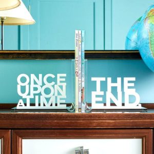 Story time begins and ends with these "ONCE UPON A TIME" & "THE END" bookends. Stylish and clever on any bookshelf. Material Content: Acrylic Care/Wash Instructions: Wipe Down PLEASE NOTE: this item does not qualify for free shipping. Due to item size/weight there is a shipping fee associated with this item.Â